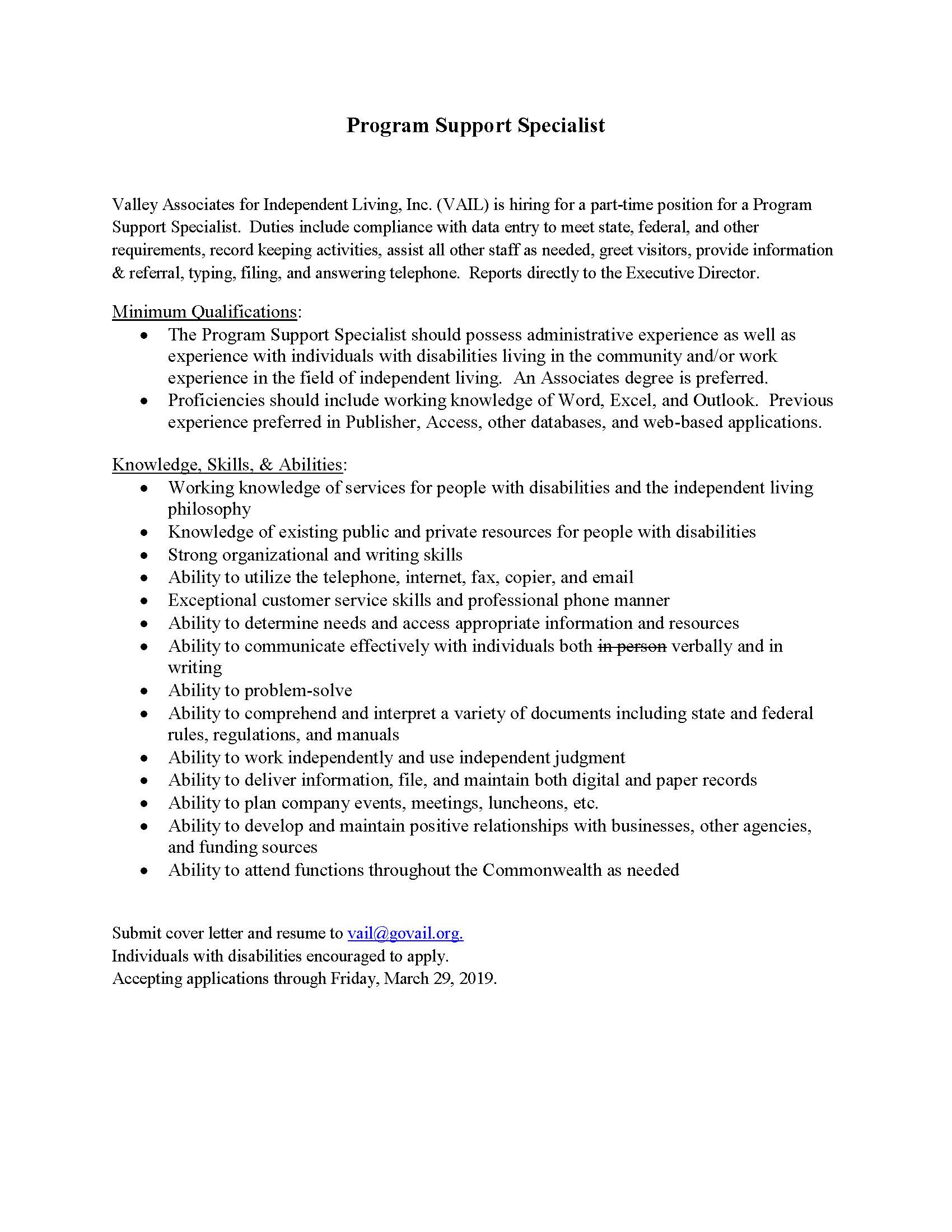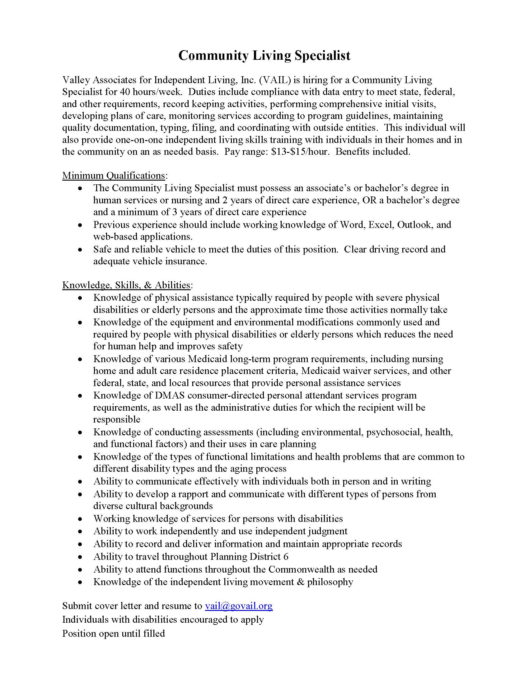 VAIL is hiring for a full-time Community Living Specialist and a part-time Program Support Specialist. Please send a resume and cover letter to vail@govail.org. Individuals with disabilities are encouraged to apply.