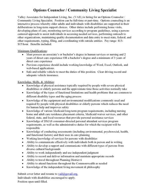 VAIL is currently looking to fill 3 positions – Community Living Specialist, Options Counselor / Community Living Specialist, and Program Support Specialist. individuals with disabilities are encouraged to apply.  Submit your resume and cover letter to vail@govail.org. Positions open until filled.